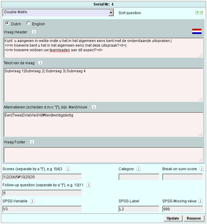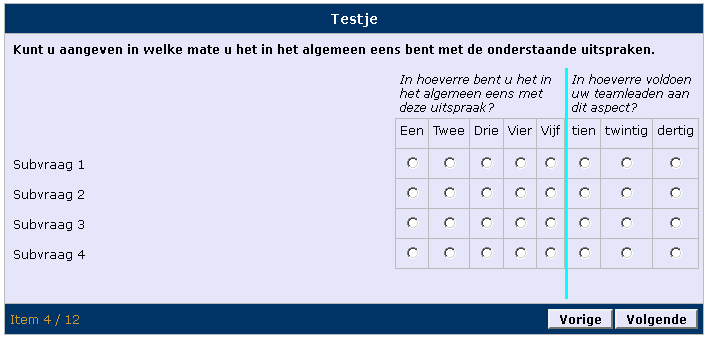 Deze speciale vraag is op aanvraag gemaakt. Het is een dubbele matrix. Links van de blauwe streep is een gewone matrix vraag en rechts van de blauwe scheidings streep komt nog een matix vraag. Er zijn links en rechts wel altijd evenveel regels (subvragen).