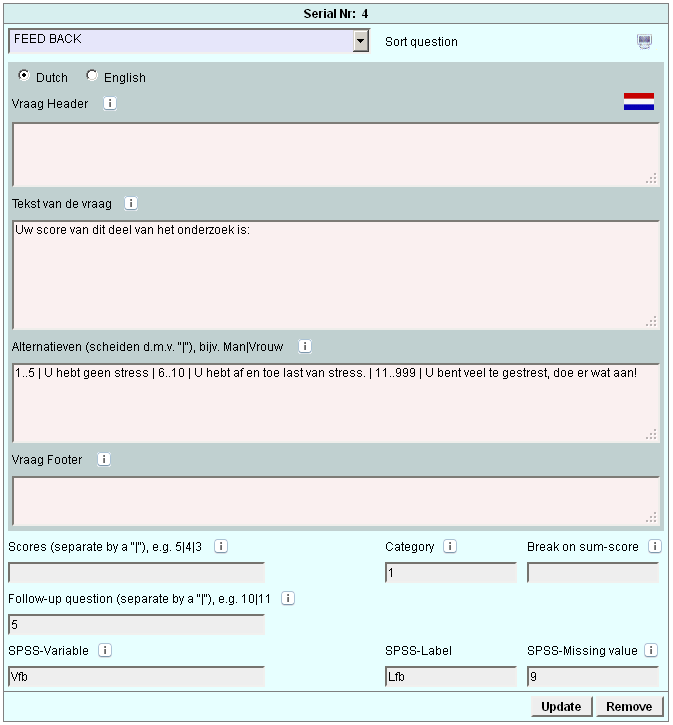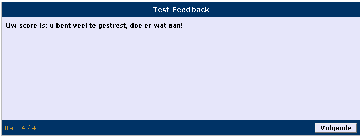 Met een item van het type Feedback kan feedback gegeven worden over de tot dan toe ingevulde vragen. Van die vragen wordt de somscore berekend en in de vraag worden ranges aangegeven om de betreffende feedback te geven.
