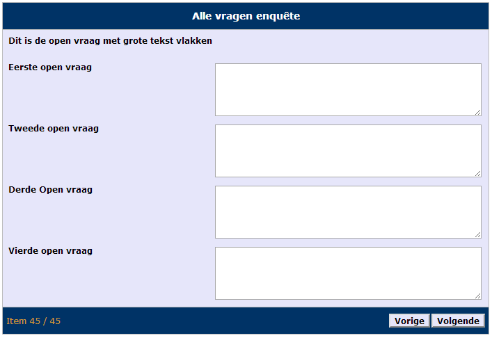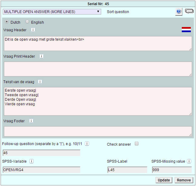 Het aantal open antwoorden hang af van het tekst veld, per tekst gescheiden door een | wordt een open vraag gemaakt.
